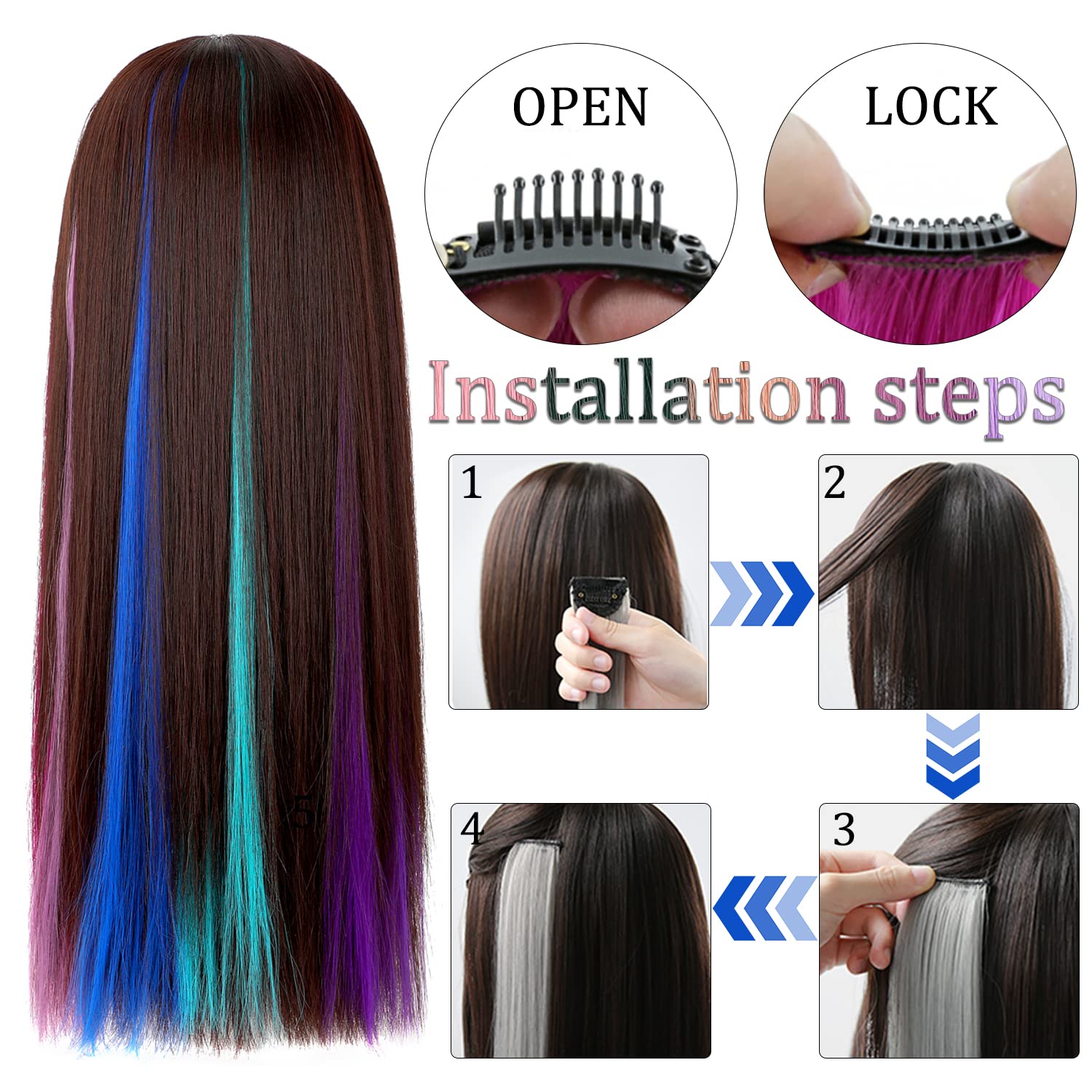 Colored Hair Extensions 24 Inch Rainbow Hair Synthetic Straight Hair Extensions For Women Girls Kids Gift Multi Colors Party Clip In Synthetic Hairpiece